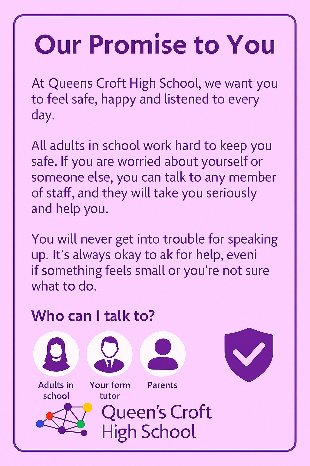 At Queens Croft High School, the safety and wellbeing of our pupils is our highest priority. We are committed to creating a safe, supportive and respectful environment where all children feel protected, valued and listened to.